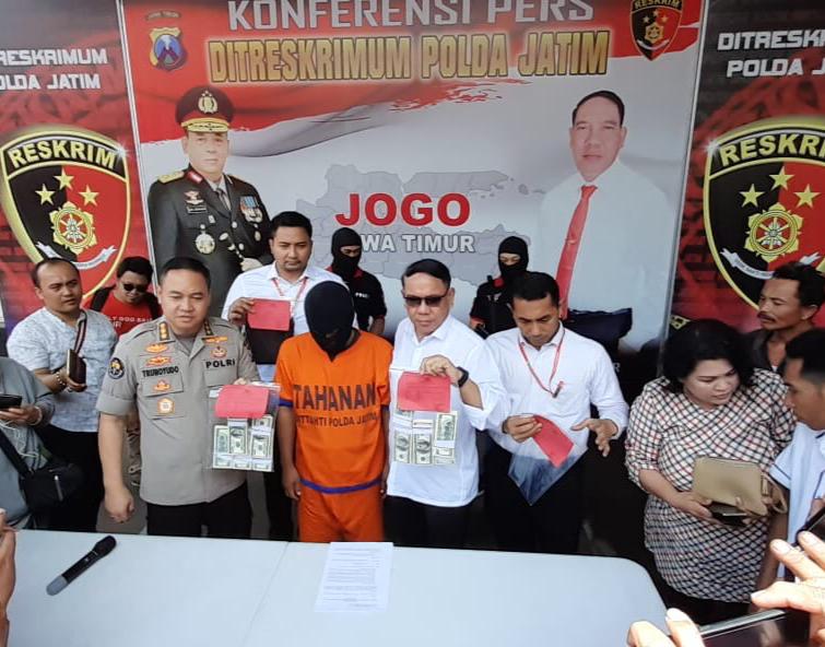 Aparat Direktorat Reserse Kriminal Umum (Ditreskrimum) Polda Jatim berhasil mengungkap kasus peredaran uang palsu dengan mata uang dollar Amerika sebesar USD 100 ribu atau senilai Rp 1,4 Miliar.