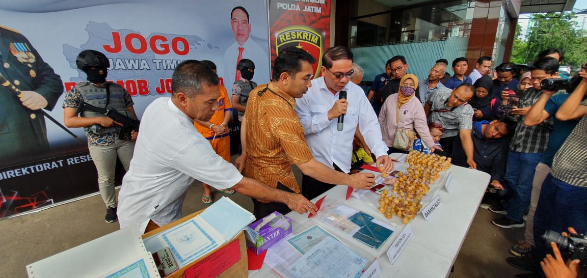 “Kita menemukan Kartu Keluarga kemudian kartu pencatatan sipil atau Akte Kelahiran yang masih kosong. Tapi kalau kita lihat saja secara fisik ini ada hologramnya,” jelas Pitra di Mapolda Jatim Surabaya, Jumat (21/2).