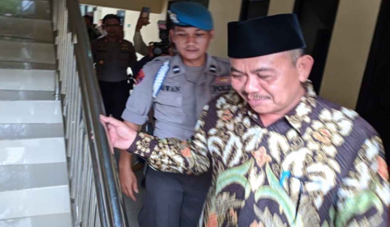 Usai menjalani pemeriksaan selama kurang lebih 1 jam, Pungkasiadi tampak turun dari lantai dua Aula Wira Pratama Mapolresta Mojokerto.