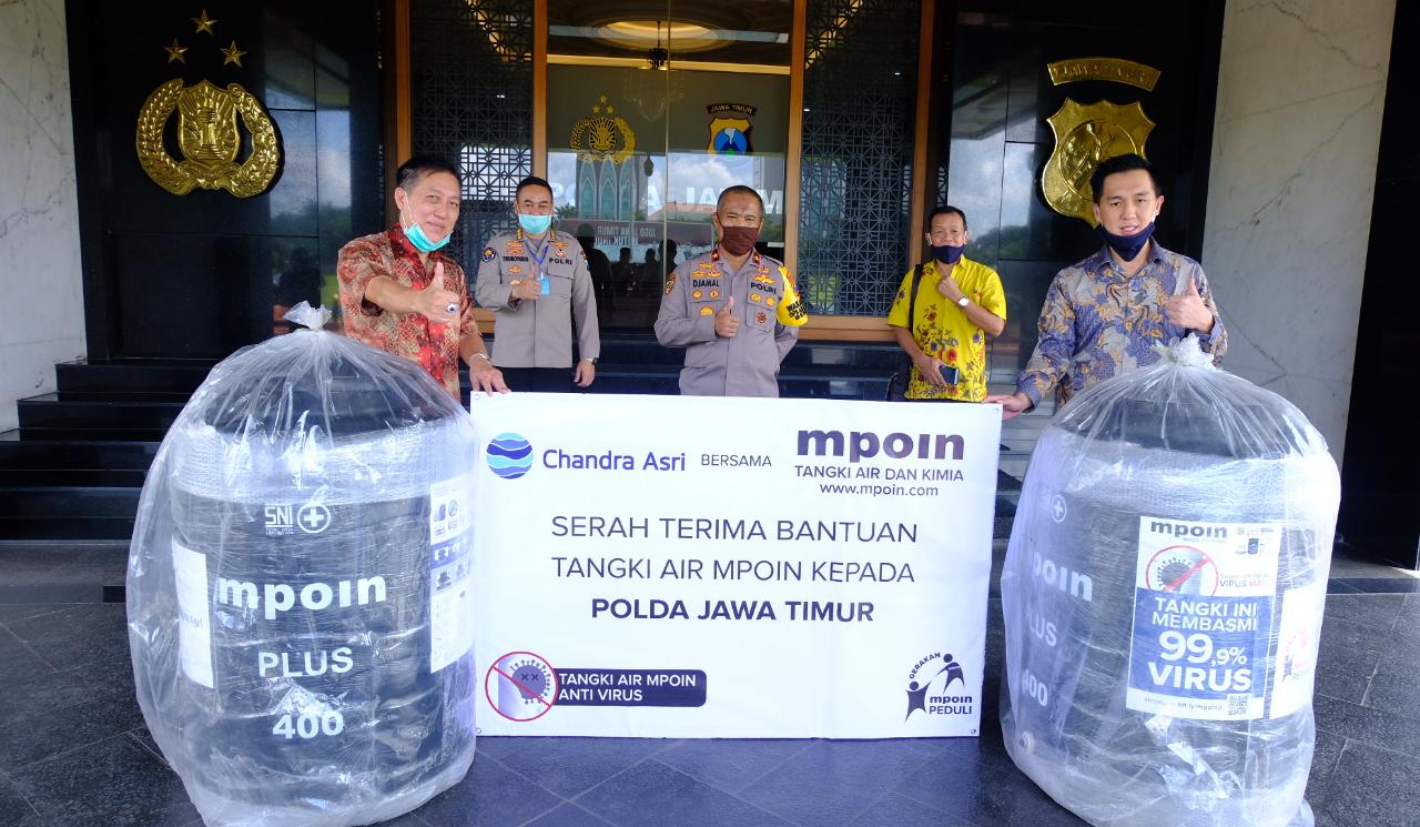 Di tengah pandemik corona virus disease atau covid-19, Kepolisian Daerah Jawa Timur menerima bantuan berupa 25 tangki air berukuran 400 liter berisi anti virus dari Mpoin bekerjasama dengan Chandra Asri Petrochemical