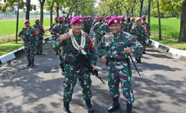 Komandan Brigif 2 Marinir Kolonel Marinir Rudi Harto Marpaung menyambut kedatangan prajuritnya yang selesai melaksanakan Satgas Muara dan Perairan (Mupe) Papua tahun 2021 di lapangan Rencong Sakti Mako Brigif 2 Marinir Gedangan, Sidoarjo, Jawa Timur.