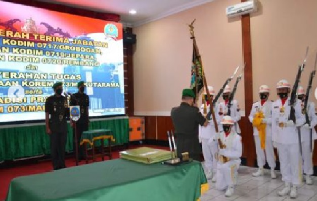 Komandan Korem 073/Makutarama Kolonel Inf Purnomosidi, S.I.P., M.A.P., memimpin langsung upacara serah terima tiga jabatan komandan Kodim jajaran Korem dan pelepasan Kasiren, Dandim 0717/Grobogan, Dandim 0719/Jepara dan Dandim 0720/Rembang.