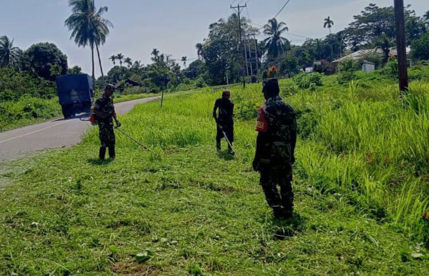 Terlihat, anggota Koramil Pantai Timur membersihkan setiap rumput liar yang berada di tepi jalan. Bukan tanpa sebab, pembersihan rumput itu dilakukan guna persiapan pemasangan baner HUT RI di lokasi itu.