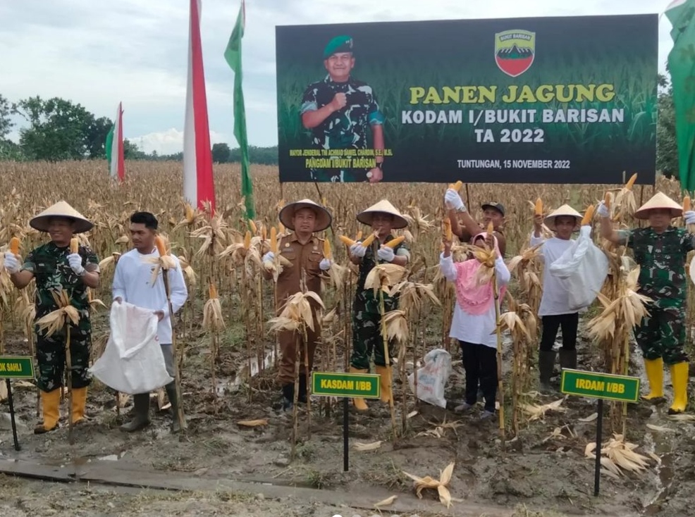 Pangdam I/BB diwakili Kasdam I/BB Brigjen TNI Brigjen TNI Rifky Nawawi SE, SIP, melaksanakan kegiatan Panen Jagung Kodam I/BB Tahun 2022 bersama Masyarakat Kelompok Tani di Desa Tuntungan II Kecamatan Pancurbatu Kabupaten Deliserdang, Selasa (15/11/2022).