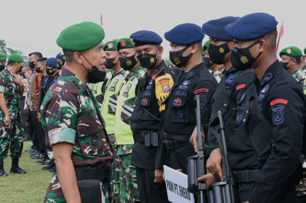 Danrem 082/CPYJ, Kolonel Inf Unang Sudargo memimpin berlangsungnya apel gelar pasukan gabungan TNI-Polri di Lapangan SMAN 1 Gedeg, Kabupaten Mojokerto, Jawa Timur. Kamis (3/11/2022) siang.
