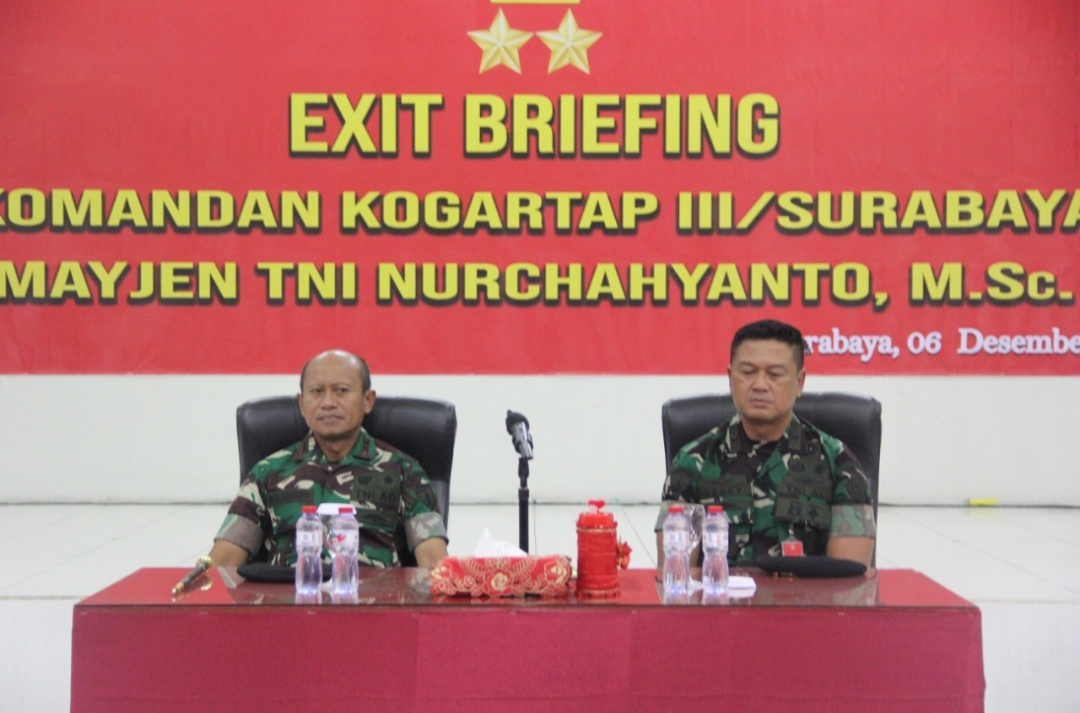 Pangdam V/Brawijaya Mayjen TNI Nurchahyanto, M.Sc., selaku Komandan Kogartap III/Surabaya, melaksanakan kunjungan kerja dalam rangka kegiatan Exit Briefing ke Makogartap III/Surabaya, Jalan Walikota Mustajab, Ketabang, Kecamatan Genteng, Kota Surabaya, Selasa, (6/12/2022).