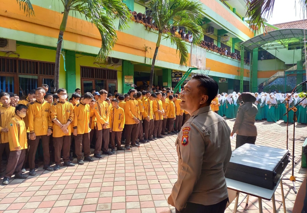 Dihadapan siswa dan siswi SMPN 3 Waru Sidoarjo, anggota Ditbinmas Polda Jatim memberikan himbauan agar para siswa waspada dan bisa menjaga diri serta menjauhi narkoba.