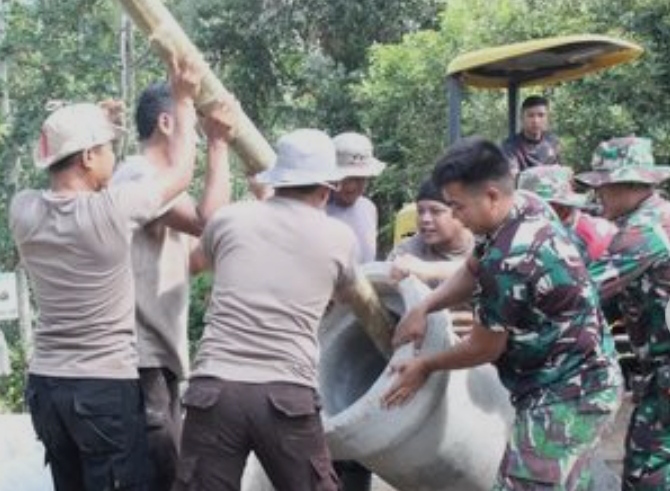 Tampak personil dari POLRI bersama TNI bekerja sama dan bergotong royong. Sinergitas dan soliditas TNI- POLRI dan masyarakat ternyata bukan sebagai slogan semata, hal ini diwujudkan oleh sejumlah prajurit TNI dan anggota POLRI serta masyarakat yang tergabung dalam satuan tugas (SATGAS) TNI Manunggal Membangun Desa (TMMD).
