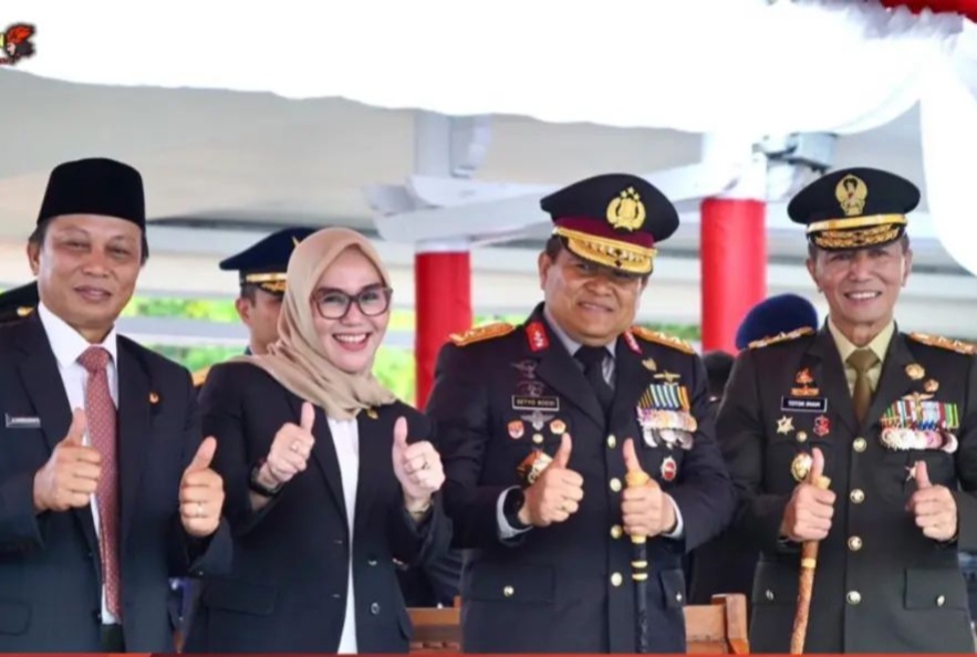 Pangdam XIV/Hasanuddin Mayjen TNI Dr. Totok Imam Santoso, S.I.P., S.Sos., M.Tr (Han)., didampingi Ketua Persit Kartika Chandra Kirana (KCK) PD XIV/Hasanuddin Ny. Desi Totok Imam menghadiri Upacara Peringatan HUT Bhayangkara ke-77 Tahun 2023, bertempat di Lapangan Upacara Kantor Gubernur Sulawesi Selatan, Kota Makassar. Sabtu (1/07/2023).