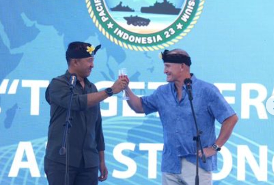 Komandan Korps Marinir (Dankormar) Mayjen TNI (Mar) Nur Alamsyah, S.E., M.M., M.Tr (Han) bersama Komandan Marines Force Pacific (Marforpac) memimpin langsung kegiatan Ice Breaking dalam rangka menyambut kedatangan para tamu delegasi negara peserta Pacific Amphibious Leaders Symposium (PALS) tahun 2023 yang digelar di pantai Hotel Hilton Bali, Nusa Dua Bali Kabupaten Badung Bali (10/07/2023).