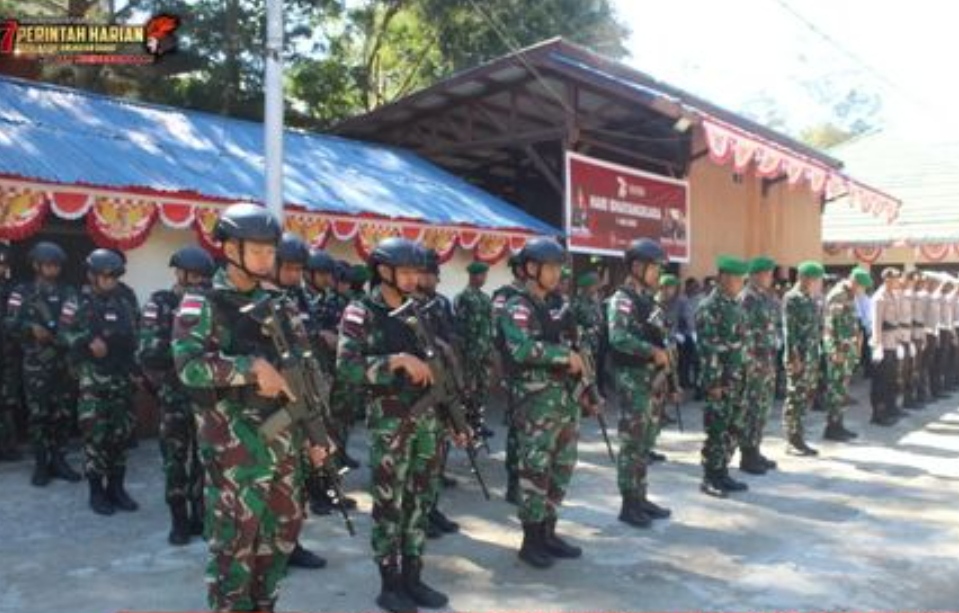 Dalam rangka memperingati HUT Bhayangkara ke-77, Satgas yonif 721/Mks bersama Koramil 1702-04 Tiom kunjungi Polres Lanny Jaya laksanakan upacara bersama, Lanny Jaya, Papua Pegunungan, Sabtu (01/07/23).