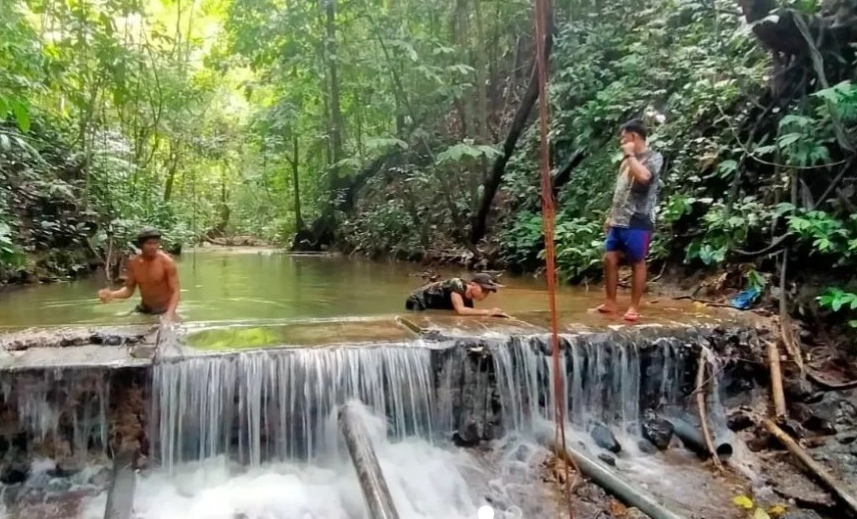 Demi kelancaran pasokan air bersih warga, prajurit Satuan Tugas Pengamanan Perbatasan (Satgas Pamtas) Yonarmed 16/TK membantu perbaikan pipa air yang mengalirkan air bersih di Dsn. Segumun, Ds. Lubuk Sabuk, Kec. Sekayam, Kab. Sanggau. Minggu, 9 Juli 2023.