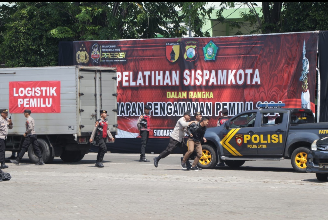 Polda Jawa Timur menggelar Bintek Pelatihan Sistem Pengamanan Kota (Sispamkota) dalam rangka kesiapan pengamanan Pemilu 2024, di Gedung Serbaguna Polresta Sidoarjo, Selasa (22/8/2023).
