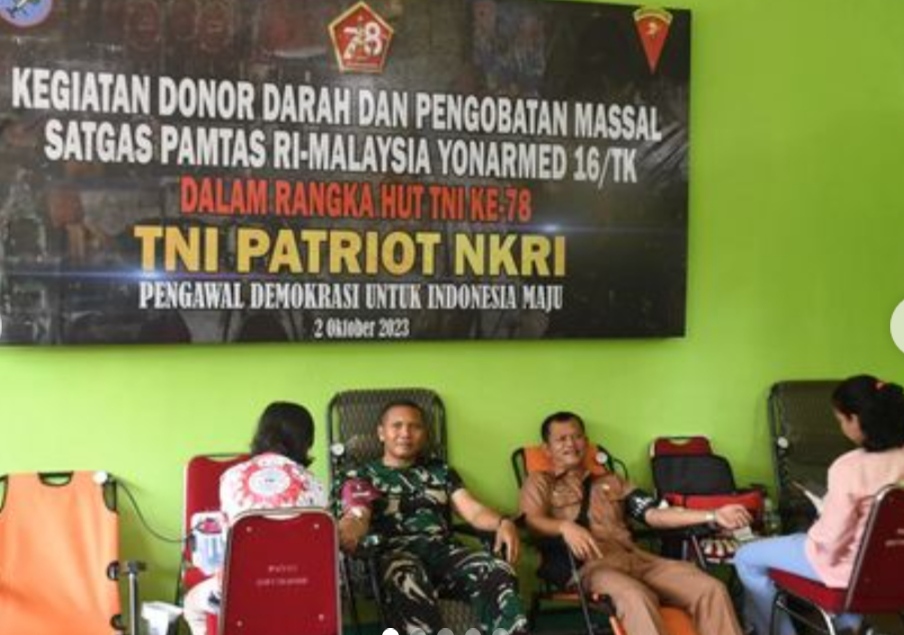 Satgas Pamtas Yonarmed 16/Tumbak Kaputing menggelar donor darah untuk memperingati HUT ke-78 TNI, Senin (2/10/2023). Donor darah dilaksanakan di Pos Komando Taktis Gabma Entikong, Kabupaten Sanggau.