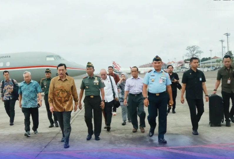 Komandan Lanud I Gusti Ngurah Rai Kolonel Pnb Agni Prayogo, S.E., menyambut kedatangan Menteri Koordinator Bidang Kemaritiman dan Investasi (Menko Marves) Bapak Luhut Binsar Pandjaitan beserta rombongan di Base Ops Lanud I Gusti Ngurah Rai Bali, Rabu (3/7/2024).