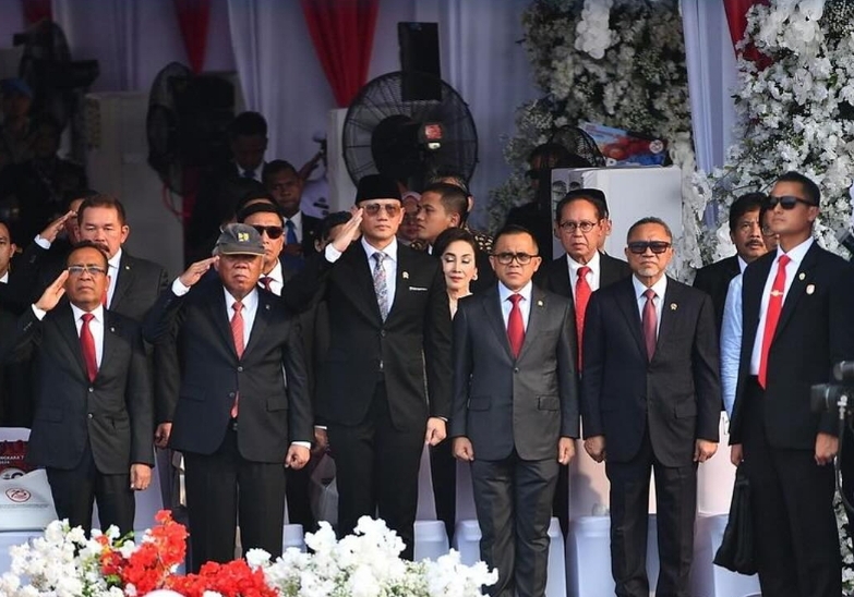 Bersama para Menteri dan Kepala Lembaga Kabinet Indonesia Maju, tokoh agama, tokoh masyarakat, serta jajaran Polri, Menteri AHY hadir meramaikan momen tersebut dengan mengenakan setelan jas dan peci berwarna hitam.