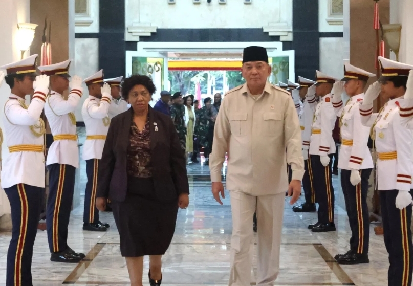 Menteri Pertahanan Republik Indonesia Sjafrie Sjamsoeddin menerima kunjungan kehormatan Minister of Defence and Military Veterans of the Republic of South Africa, Matsie Angelina Motshekga, di kantor Kementerian Pertahanan, Jakarta, Rabu (22/10/2025).