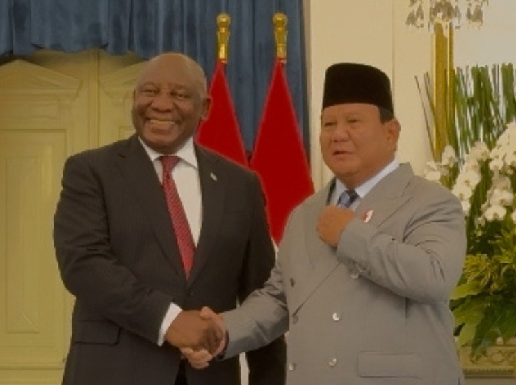 Presiden Ramaphosa tiba di Istana Merdeka sekitar pukul 11.03 WIB dengan pengawalan ketat dan langsung disambut oleh Prabowo.