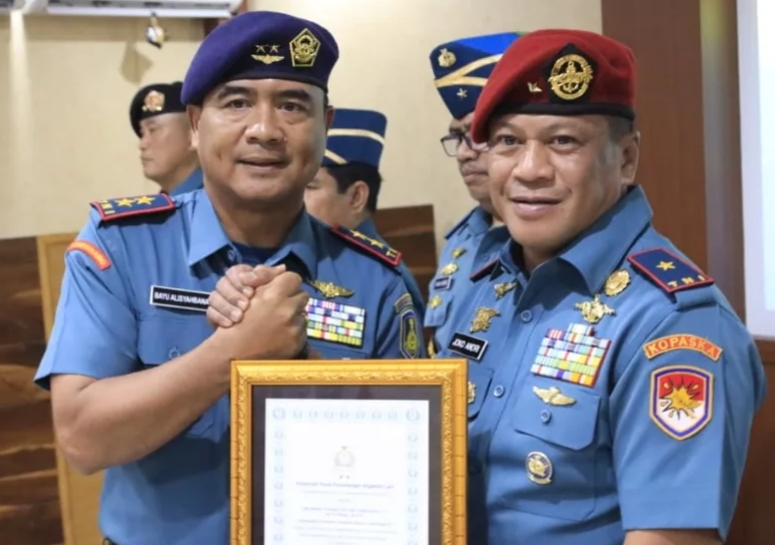 Komandan Komando Pasukan Katak (Kopaska) Laksamana Pertama TNI Joko Andriyanto, S.T., M.Tr.Hanla., M.A.P., menerima Brevet Kehormatan Penerbangan TNl Angkatan Laut yang disematkan langsung Komandan Pusat Penerbangan TNI AL (Danpuspenerbal) Laksamana Muda TNl Bayu Alisyahbana di Rupat Mako Puspenerbal, Juanda. Sidoarjo. Rabu (19/11/2025).