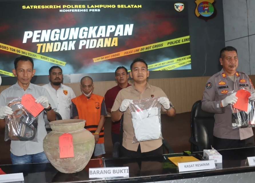 Selain mengamankan pelaku, dari ungkap kasus tersebut polisi juga menyita barang bukti berupa dua gentong tanah liat, kain putih bertulisan Arab, tasbih, alat hisap sabu, dan uang pecahan Rp100.