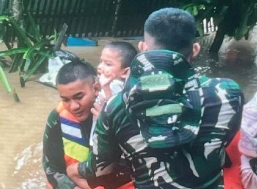 Di tengah darurat bencana yang melanda, seorang prajurit TNI setia menjalankan tugas kemanusiaan dengan mengevakuasi dan menolong korban. Rabu ((3/12/2025).