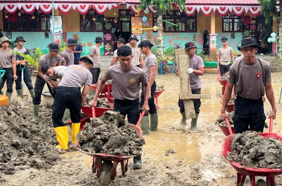 Dipimpin oleh Danki Penugasan AKP Elan Suherlan, S.H., para personel Brimob dengan penuh semangat menyingsingkan lengan baju, menyapu, mengeruk, dan mengangkat lumpur yang mengendap di ruang kelas maupun halaman sekolah.