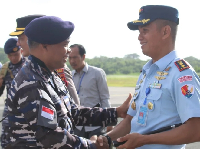 Komandan Lanud Ignatius Dewanto, Letkol Pom Made Oka Dharmayasa, M.Han., turut menyambut kedatangan Wakil Komandan Komando Daerah Angkatan Laut (Wadankodaeral) IX, Laksamana Pertama (Laksma) TNI Dr. Muhammad Risahdi, M.Si.(Han)., M.Tr.Opsla., beserta rombongan di Bandara Mathilda Batlayeri, Kabupaten Kepulauan Tanimbar, Selasa (13/1/2026).