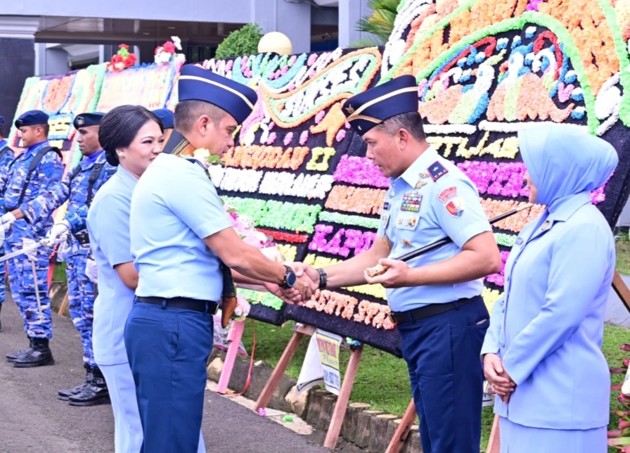 Komandan Lanud Sultan Hasanuddin Marsma TNI Arifaini Nur Dwiyanto, M.Han., didampingi Ketua PIA Ardhya Garini Cabang 2/D.II Lanud Sultan Hasanuddin Ny. Betty Arifaini Nur Dwiyanto, mengikuti acara tradisi Passing In–Passing Out Pangkodau II di Makodau II, Makassar, Jumat (9/1/2026).