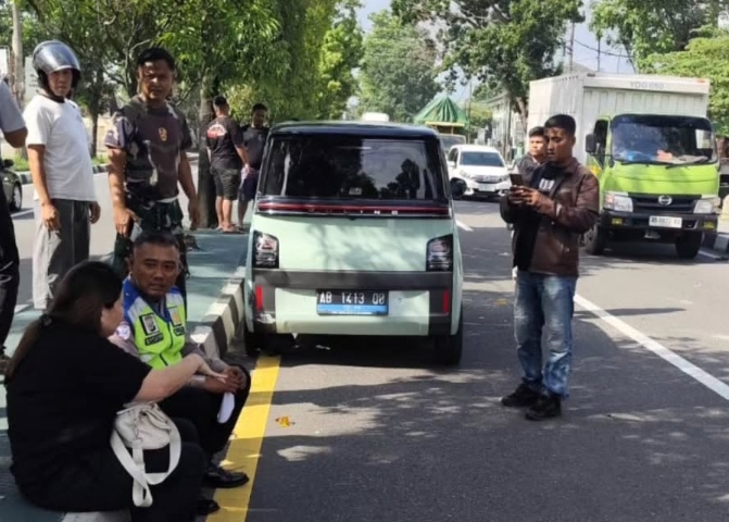 Petugas Piket Lantas Polsek Gamping Polresta Sleman menangani kejadian kecelakaan lalu lintas tunggal yang melibatkan mobil listrik Wuling nomor polisi AB 1413 QQ di Jl. Siliwangi, tepatnya sebelah timur Gapura Dusun Kradenan, Kalurahan Banyuraden, Kapanewon Gamping, Kabupaten Sleman, Rabu sore (14/01/2026).