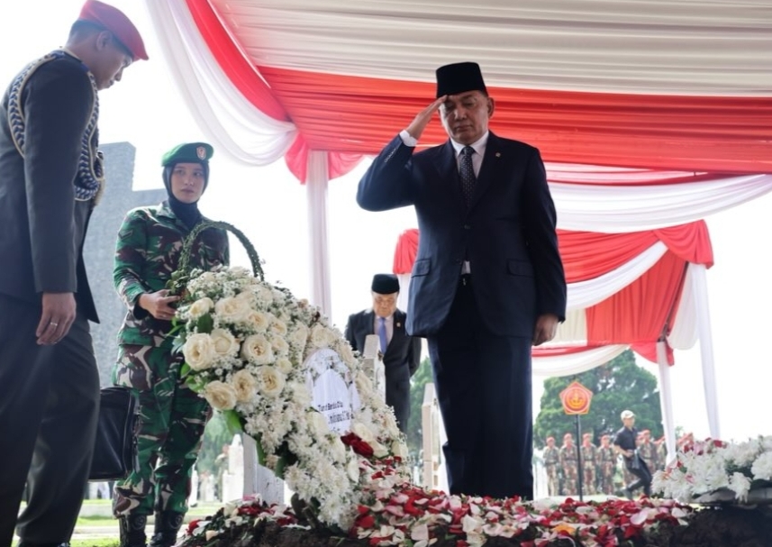 Menteri Pertahanan Sjafrie Sjamsoeddin menghadiri upacara pemakaman militer Mayor Inf Anumerta Zulmi Aditya Iskandar di Taman Makam Pahlawan Cikutra, Bandung, pada Minggu (5/4/2026).